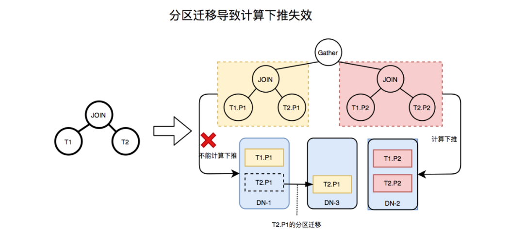 在PolarDB-X中,为加速SQL的执行效率,优化器会尝试将分区表之间Join操作优化为Partition-Wise Join来做计算下推。但是,当分区表的拓扑发生变更后,例如,在水平扩展中,分区会经常发生了分裂、合并或迁移后,原本分区方式完全相同的两张分区表,就有可能出现分区方区不一致,这导致这两张表之间的计算下推会出现失效(如下图所示),进而对业务产生直接影响。因此,与CockroachDB相比, PolarDB-X 创造性地通过引入表组与分区组来解决这类问题。