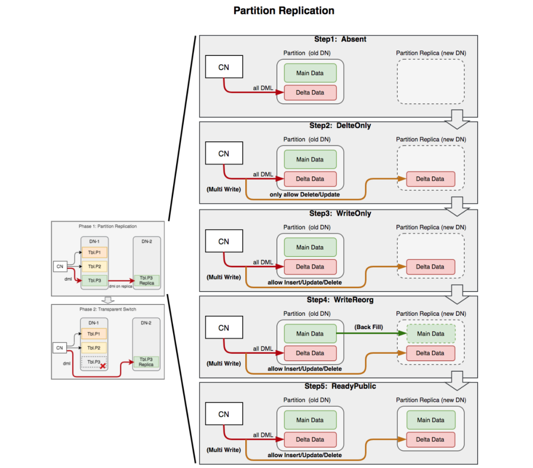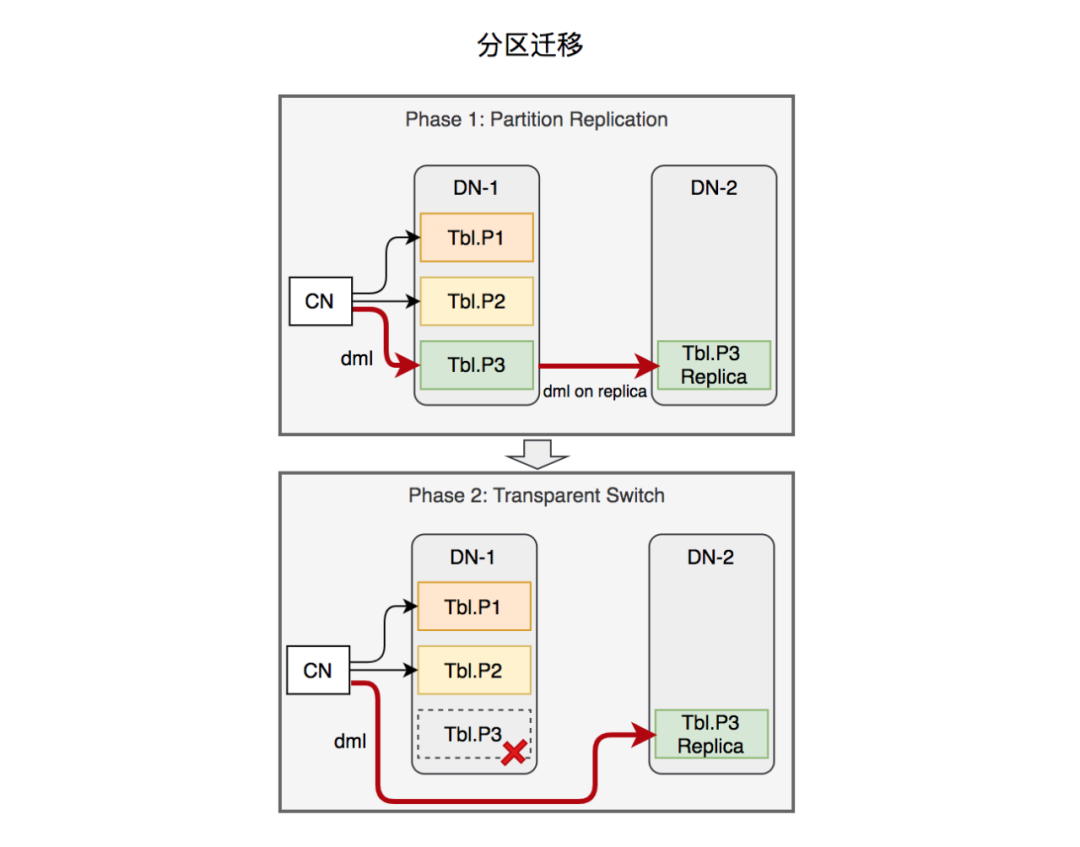 分区迁移通常需要两个步骤分区复制与流量切换两个阶段。像 CockroachDB 基于 Raft 协议来完成跨节点间的数据复制以及 Leader切换(流量切换),所以它的分区迁移能几乎全被封装Raft协议里进行。但是,PolarDB-X 跨DN节点之间的分区复制,并没有基于 Raft/Paxos 协议 ,而是参考 SAP HANA 提出的非对称分区复制[2] 的思路,采用了 Online DDL [1] 的方案。