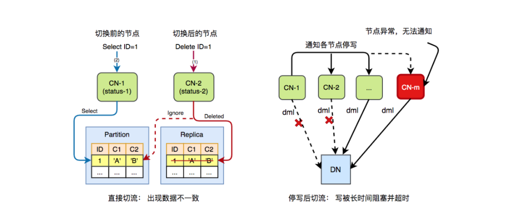 如果采用直接切流的方案(上图左侧),那切换期间分布式系统中便会因为节点状态不兼容(因为所有节点不可能在同一时间完成切换)而导致出现数据不一致;如果采用停写后再切流的方案(上图右侧),那需要通知分布式系统所有节点来阻塞业务所有的写操作,但通知过程本身时间不可控(或网络故障或节点自身不可用),应用有可能导致被长时间阻塞写,从而使应用侧会产生超时异常。可见,无论是直接切流还是停写后再切流的方案,都不能满足保持透明的要求。