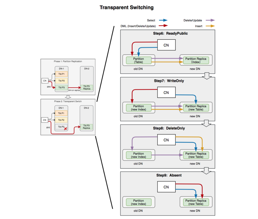 PolarDB-X为了实现透明的切换效果,其思路是将目标端分区看作是主表,将源端分区看作是索引表,并对主表进行一次标准的删除索引的 Online DDL 操作(其状态过程是 Public-->WriteOnly-->DeleteOnly-->Absent ,与 Online Schema Change 定义的一致)。