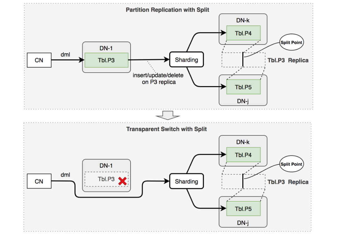 更具体来说,就是 PolarDB-X 会将分区副本的数据复制操作,看作是一次给主表(源端DN节点)添加一个特殊索引(目标端DN节点)的DDL操作,这个特殊索引会冗余主表所有的列。所以,整个分区复制的过程就等价于基于 Online DDL 添加一次索引。类似地,PolarDB-X的流量切换没有借助走 Raft/Paxos 协议的切主来进行切流,而是采用基于 Online DDL 删除索引的方式来完成流量从源端(老DN节点)到目标端(新DN节点)的对应用近乎透明的平滑切换,这个过程在PolarDB-X中被称为透明切换。