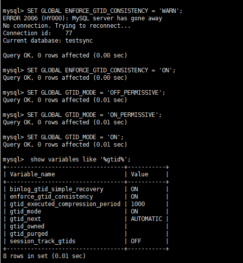 (1):SET GLOBAL ENFORCE_GTID_CONSISTENCY = 'WARN';