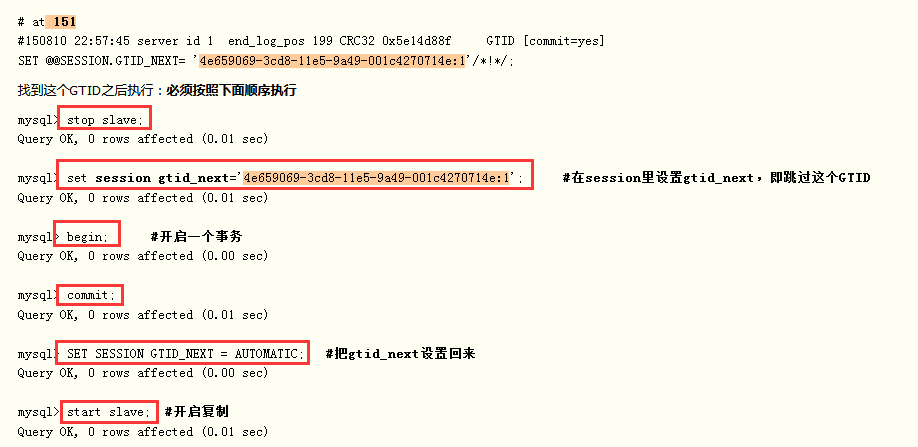 1)对于跳过一个错误,找到无法执行事务的编号,比如是2a09ee6e-645d-11e7-a96c-000c2953a1cb:1-10