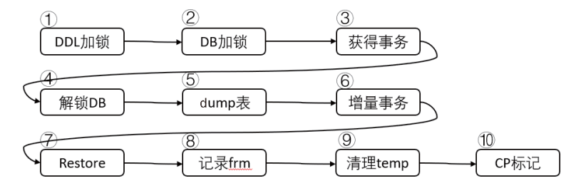 (1) 加 DDL 锁。CP 操作过程中,不允许对表做增删字段等修改表结构的动作,加 DDL 锁可以防止 DDL 操作,也不会创建新表和删除表。同时为了减少 DDL 锁持有时间,在拿到 DDL 锁后,将当前所有的表加上读锁,记录当前表列表,然后释放 DDL 锁。后续针对记录的列表来进行操作。
