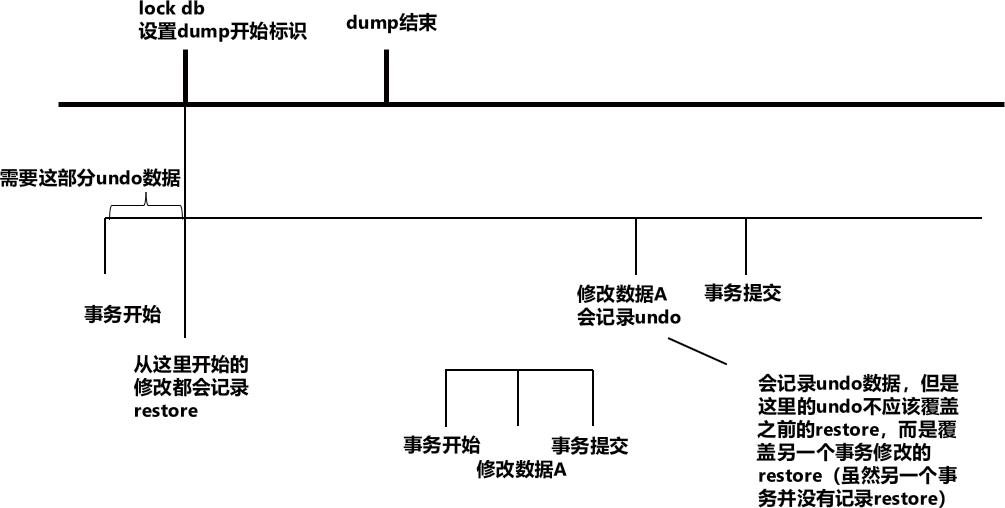 (5) dump 表数据。一个表对应一个线程,将表写入磁盘中。在这个过程中,所有事务执行的修改操作,都会记录 restore 信息。
