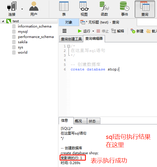 然后输入创建数据库的sql语句,点击运行,可以看到sql语句执行结果。