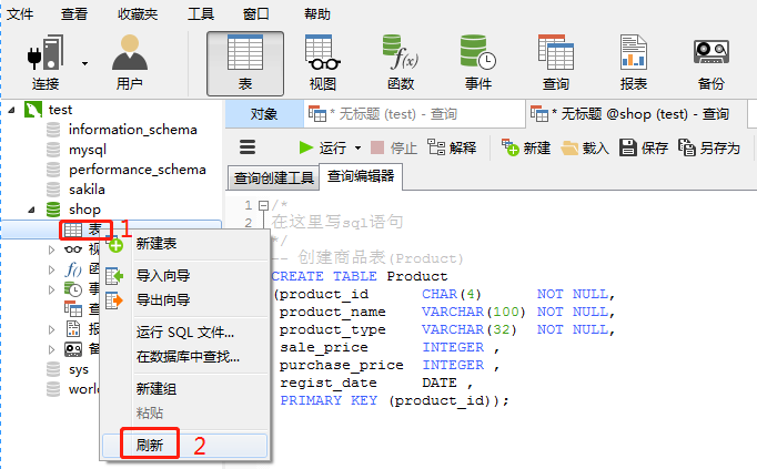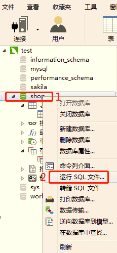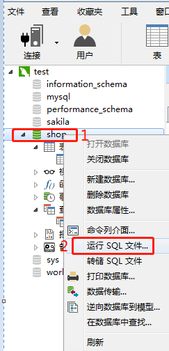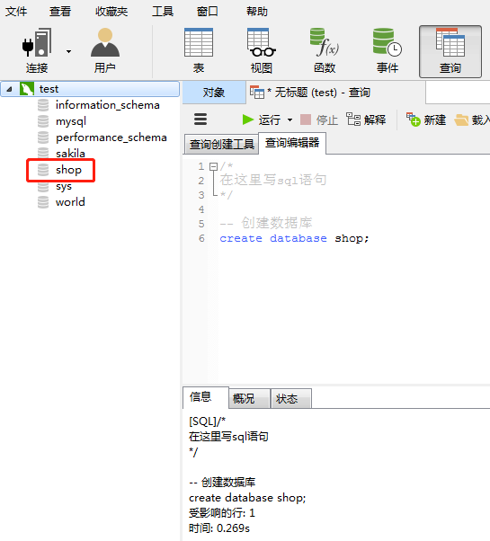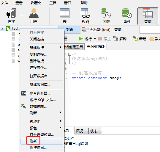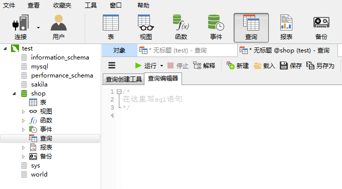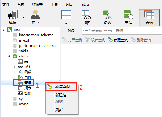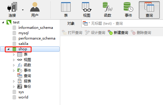 点击数据库(shop)下的查询,鼠标右键选中“新建查询”。以这种方式打开的查询编辑器里的sql语句都是针对当前这个数据库的。