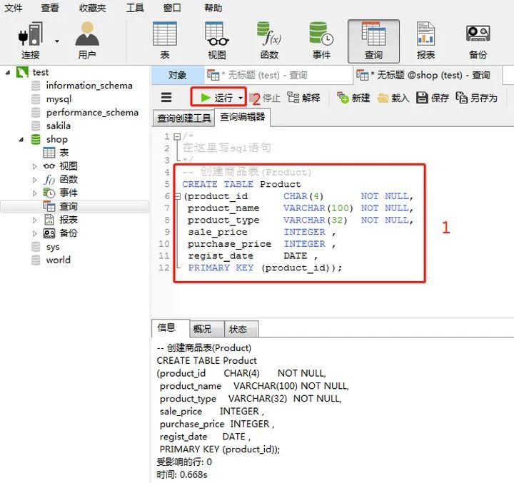 在查询编辑器里输入下面创建商品表(Product)的sql语句,点击“运行”按钮就会执行sql语句。