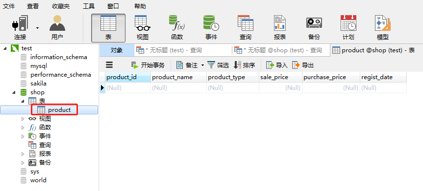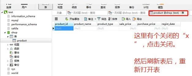 数据库shop名称前面的图标是灰色的,表示当前没有使用这个数据库。