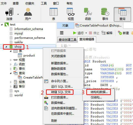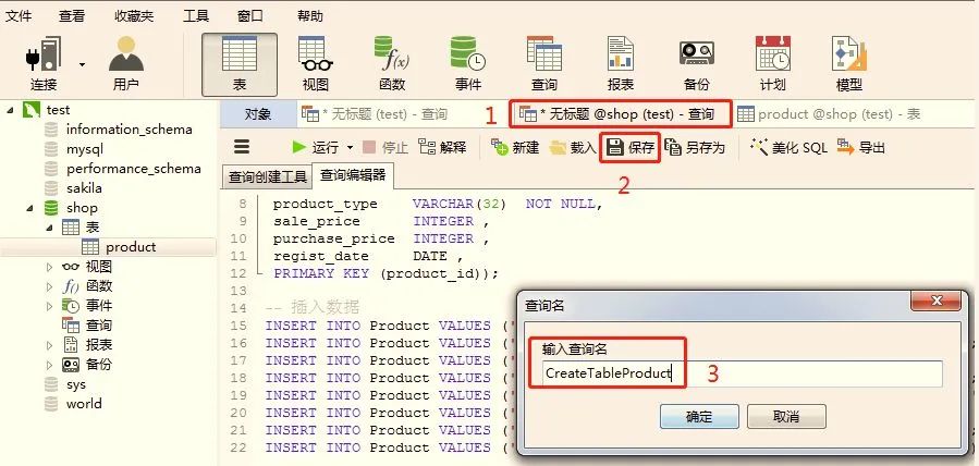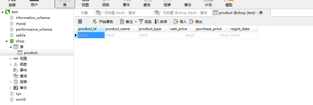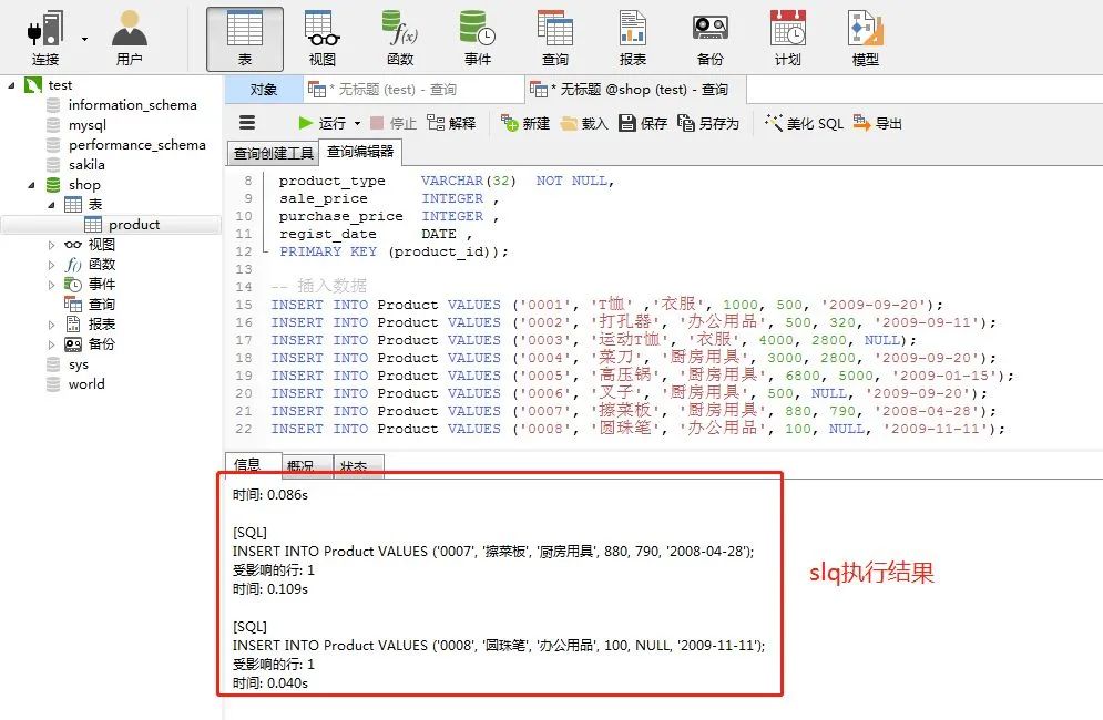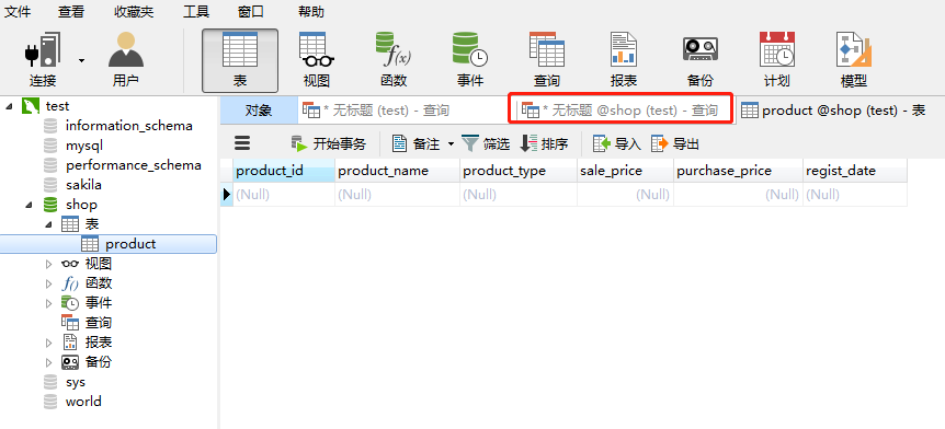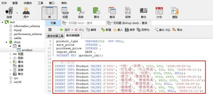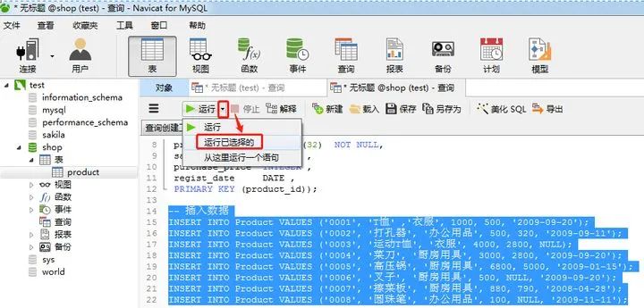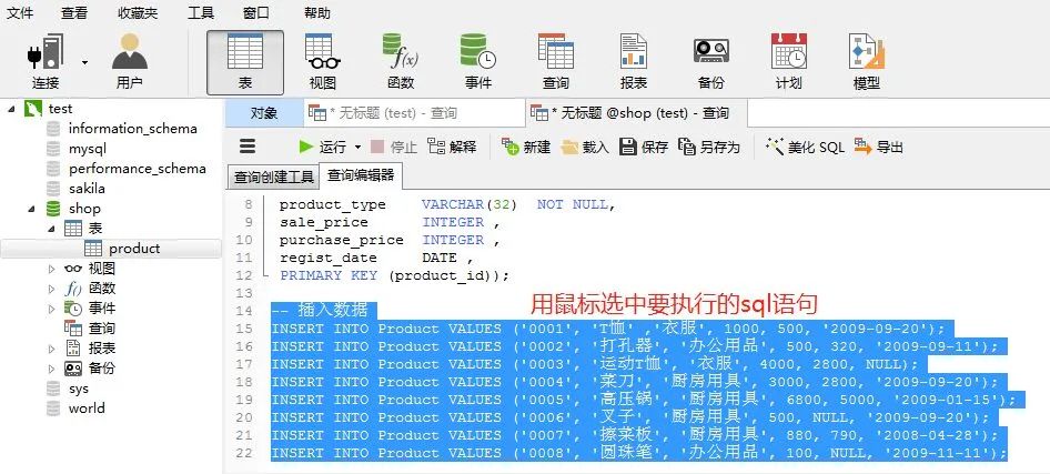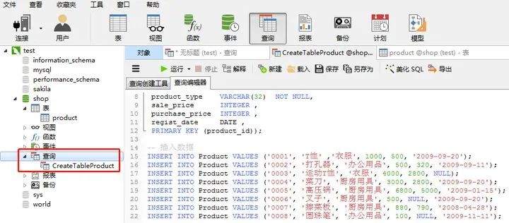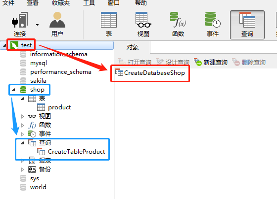 而数据库shop下创建的sql语句保存在它自己的查询里面(图中蓝色部分),表示这里的语句是针对这个特定的数据库的操作。