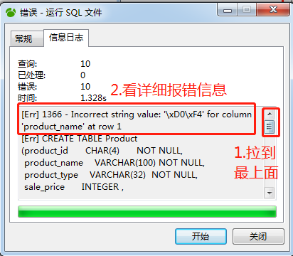 将下图1处的下拉框拉到最上面,我们就可以看到详细的报错信息是:[Err] 1366 - Incorrect string value: "\xD0\xF4" for column。