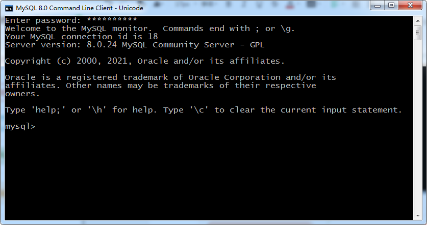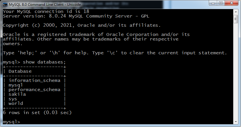 输入完后,出现结果为如下:输入 show databases; 注意要带‘;’。