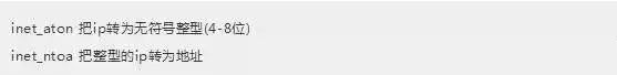 插入数据前,先用inet_aton把ip地址转为整型,可以节省空间。显示数据时,使用inet_ntoa把整型的ip地址转为地址显示即可。