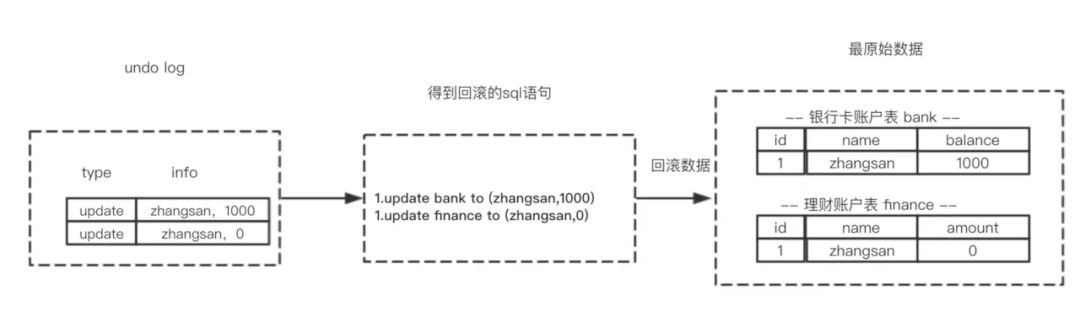 为了做到同时成功或者失败,当系统发生错误或者执行rollback操作时需要根据undo log 进行回滚