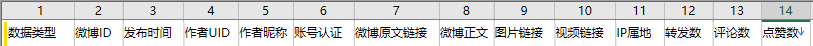 微博ID、时间、发布者UID、发布者昵称、账号认证、微博原文链接、微博正文、图片链接、视频链接、IP属地、转发数、评论数、点赞数、数据类型。
