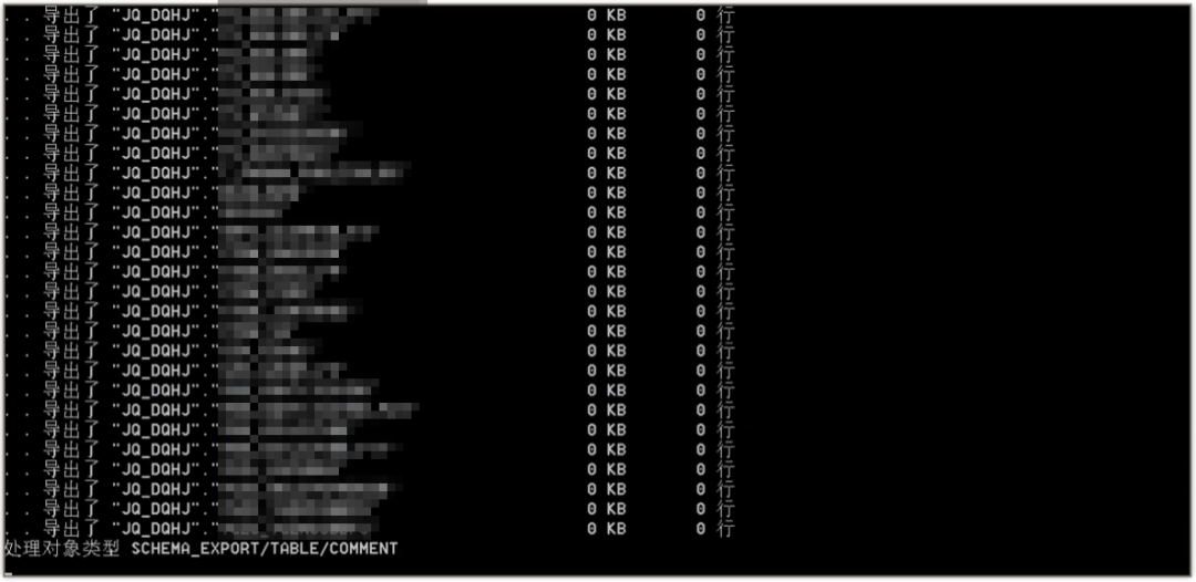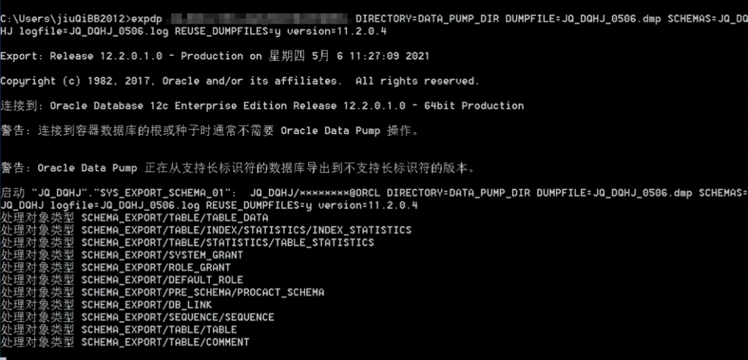 expdp User1/xxxxxx DIRECTORY=DATA_PUMP_DIR DUMPFILE=dump%u.dmp SCHEMAS=user1 logfile=dump.log REUSE_DUMPFILES=y version=11.2.0.4 parallel=7 exclude=index,statistics,commentExport: Release 12.2.0.1.0 - Production on 星期六 5月 8 14:28:25 2021Copyright (c) 1982, 2017, Oracle and/or its affiliates. All rights reserved.;;;连接到: Oracle Database 12c Enterprise Edition Release 12.2.0.1.0 - 64bit Production启动 "JQ_DQHJ"."SYS_EXPORT_SCHEMA_05": JQ_DQHJ/********@ORCL DIRECTORY=DATA_PUMP_DIR DUMPFILE=JQ_DQHJ_0506%u.dmp SCHEMAS=JQ_DQHJ logfile=JQ_DQHJ_0506.log REUSE_DUMPFILES=y version=11.2.0.4 parallel=7 exclude=index,statistics,comment处理对象类型 SCHEMA_EXPORT/SYSTEM_GRANT处理对象类型 SCHEMA_EXPORT/ROLE_GRANT处理对象类型 SCHEMA_EXPORT/DEFAULT_ROLE处理对象类型 SCHEMA_EXPORT/PRE_SCHEMA/PROCACT_SCHEMA处理对象类型 SCHEMA_EXPORT/DB_LINK处理对象类型 SCHEMA_EXPORT/SEQUENCE/SEQUENCE处理对象类型 SCHEMA_EXPORT/PROCEDURE/PROCEDURE处理对象类型 SCHEMA_EXPORT/PROCEDURE/ALTER_PROCEDURE处理对象类型 SCHEMA_EXPORT/VIEW/VIEW处理对象类型 SCHEMA_EXPORT/TABLE/TABLE处理对象类型 SCHEMA_EXPORT/TABLE/TABLE_DATA处理对象类型 SCHEMA_EXPORT/TABLE/TRIGGER处理对象类型 SCHEMA_EXPORT/TABLE/CONSTRAINT/CONSTRAINT. . 导出了 "JQ_DQHJ"."xxxxx" 2.324 GB 16680448 行. . 导出了 "JQ_DQHJ"."xxxxx" 100.5 MB 736100 行. . 导出了 "JQ_DQHJ"."xxxxx" 76.13 MB 540523 行. . 导出了 "JQ_DQHJ"."xxxxx" 358.5 MB 3763946 行. . 导出了 "JQ_DQHJ"."xxxxx" 58.51 MB 113659 行. . 导出了 "JQ_DQHJ"."xxxxx" 69.97 MB 972899 行. . 导出了 "JQ_DQHJ"."xxxxx" 70.27 MB 487070 行. . 导出了 "JQ_DQHJ"."xxxxx" 358.7 MB 3766014 行. . 导出了 "JQ_DQHJ"."xxxxx" 62.53 MB 514032 行. . 导出了 "JQ_DQHJ"."xxxxx" 57.37 MB 413931 行. . 导出了 "JQ_DQHJ"."xxxxx" 57.37 MB 413931 行. . 导出了 "JQ_DQHJ"."xxxxx" 60.78 MB 1114354 行. . 导出了 "JQ_DQHJ"."xxxxx" 45.04 MB 490894 行. . 导出了 "JQ_DQHJ"."xxxxx" 43.82 MB 189888 行. . 导出了 "JQ_DQHJ"."xxxxx" 39.10 MB 153007 行. . 导出了 "JQ_DQHJ"."xxxxx" 29.69 MB 58124 行. . 导出了 "JQ_DQHJ"."xxxxx" 34.99 MB 414911 行. . 导出了 "JQ_DQHJ"."xxxxx" 2.325 GB 16682516 行. . 导出了 "JQ_DQHJ"."xxxxx" 39.46 MB 7637 行. . 导出了 "JQ_DQHJ"."xxxxx" 34.99 MB 414911 行. . 导出了 "JQ_DQHJ"."xxxxx" 32.51 MB 158571 行. . 导出了 "JQ_DQHJ"."xxxxx" 34.67 MB 562784 行省略了大量的输出。。。。。。。。。. . 导出了 "JQ_DQHJ"."xxxxx" 5.523 KB 2 行. . 导出了 "JQ_DQHJ"."xxxxx" 5.531 KB 2 行. . 导出了 "JQ_DQHJ"."xxxxx" 5.539 KB 3 行. . 导出了 "JQ_DQHJ"."xxxxx" 5.531 KB 2 行. . 导出了 "JQ_DQHJ"."xxxxx" 5.531 KB 3 行. . 导出了 "JQ_DQHJ"."xxxxx" 5.523 KB 2 行. . 导出了 "JQ_DQHJ"."xxxxx" 5.523 KB 2 行已成功加载/卸载了主表 "JQ_DQHJ"."SYS_EXPORT_SCHEMA_05"******************************************************************************JQ_DQHJ.SYS_EXPORT_SCHEMA_05 的转储文件集为:E:\APP\ORACLE\ADMIN\ORCL\DPDUMP\JQ_DQHJ_050601.DMPE:\APP\ORACLE\ADMIN\ORCL\DPDUMP\JQ_DQHJ_050602.DMPE:\APP\ORACLE\ADMIN\ORCL\DPDUMP\JQ_DQHJ_050603.DMPE:\APP\ORACLE\ADMIN\ORCL\DPDUMP\JQ_DQHJ_050604.DMPE:\APP\ORACLE\ADMIN\ORCL\DPDUMP\JQ_DQHJ_050605.DMPE:\APP\ORACLE\ADMIN\ORCL\DPDUMP\JQ_DQHJ_050606.DMPE:\APP\ORACLE\ADMIN\ORCL\DPDUMP\JQ_DQHJ_050607.DMPE:\APP\ORACLE\ADMIN\ORCL\DPDUMP\JQ_DQHJ_050608.DMPE:\APP\ORACLE\ADMIN\ORCL\DPDUMP\JQ_DQHJ_050609.DMPE:\APP\ORACLE\ADMIN\ORCL\DPDUMP\JQ_DQHJ_050610.DMPE:\APP\ORACLE\ADMIN\ORCL\DPDUMP\JQ_DQHJ_050611.DMP作业 "JQ_DQHJ"."SYS_EXPORT_SCHEMA_05" 已于 星期六 5月 8 14:37:45 2021 elapsed 0 00:09:18 成功完成