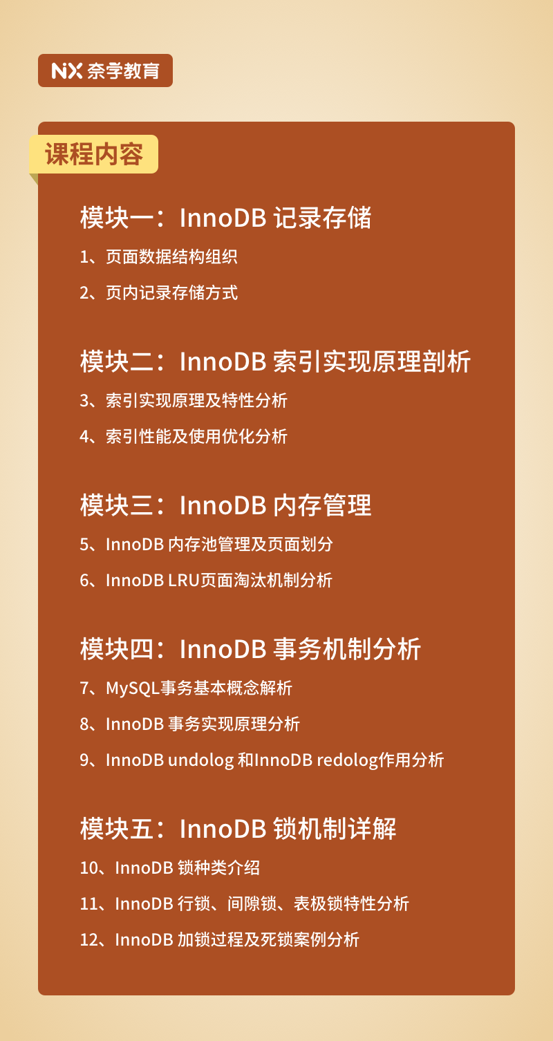 内容包括了MySQL默认存储引擎InnoDB的记录存储、索引、内存管理、事务、锁五大模块,讲师将带你深度剖析MySQL InnoDB 存储引擎实现原理,结合面试讲解那些平时使用数据库时高频出现的知识点,并通过实践跟你探讨相关的问题。