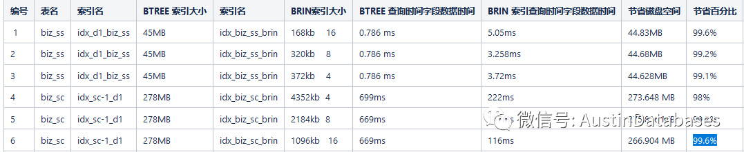 | 3 | biz_ss | idx_d1_biz_ss | 45MB | idx_biz_ss_brin | 372kb 4 | 0.786 ms | 3.72ms | 44.628MB | 99.1% |