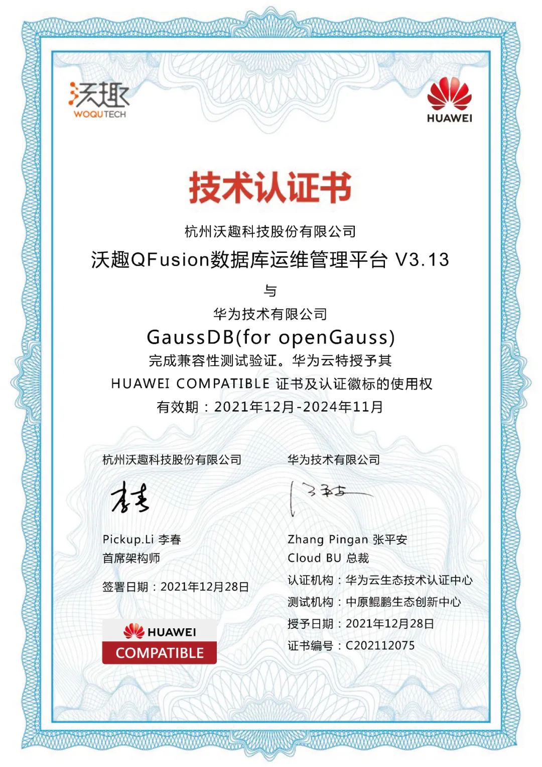 沃趣科技QFusion&华为云GaussDB兼容性认证