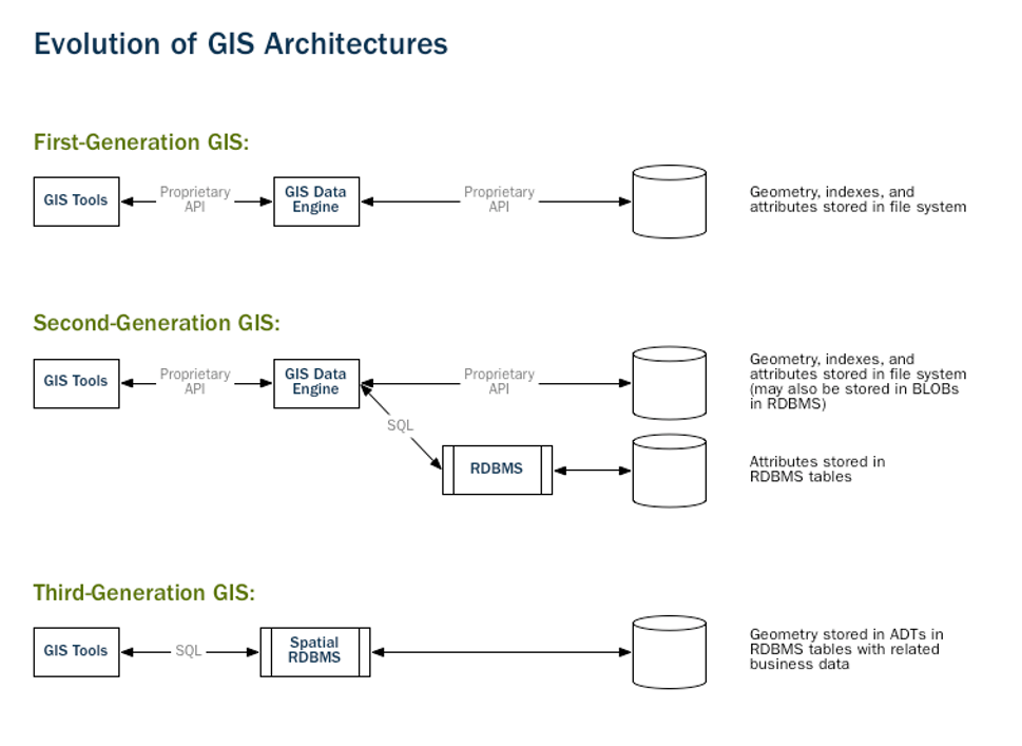 统计与分析轨迹和地理区域的关联问题,是 GIS 主要的应用类别之一。最早的 GIS 应用以桌面应用程序为主,但随着需处理应用越来越复杂,GIS 的开发框架也在逐年演进。就像复杂的数据操作和应用催生了以数据独立性为主旨的数据库一样,Spatial RDBMS (空间数据库) ,也就是 GIS in Database 逐渐形成。我们知道,在数据库内,数据的操作被逐渐标准化,让更多的应用开发有了更低的门槛。