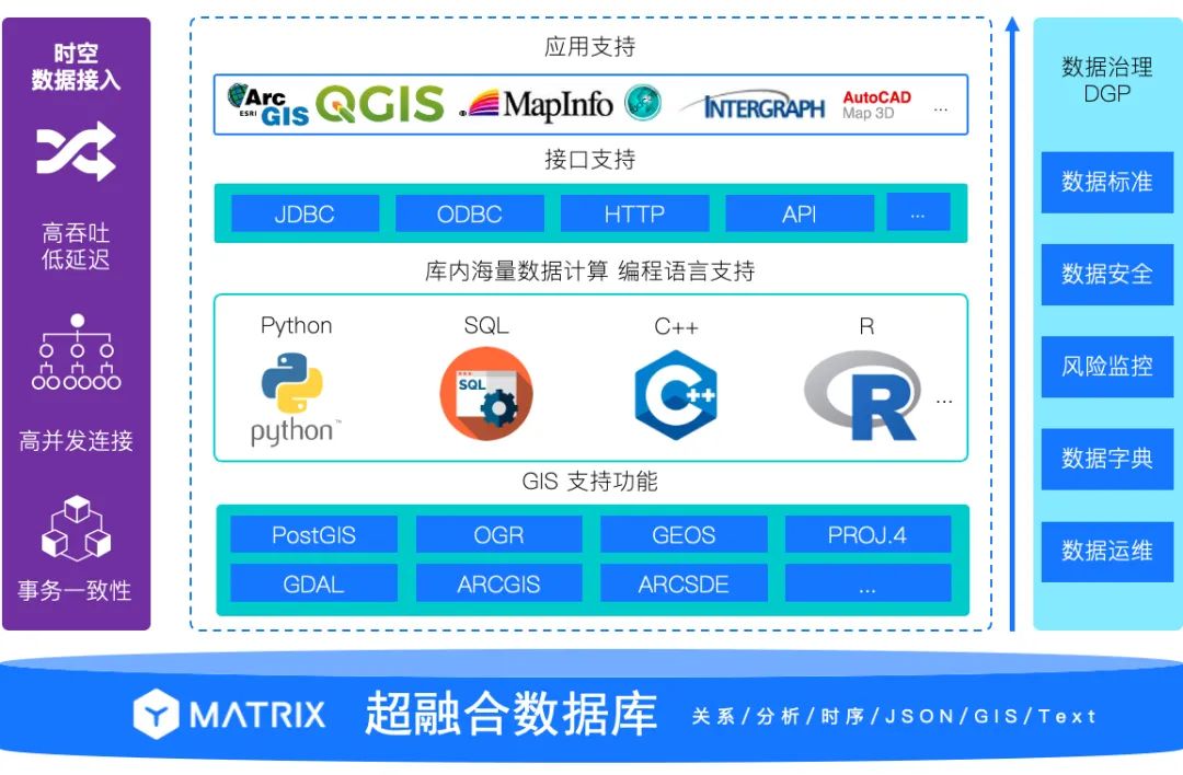 超融合数据库 YMatrix 基于PostgreSQL 与 Greenplum 深度优化而来。具有前者优秀的 GIS 能力与后者的分布式、库内计算能力的同时,在存储引擎层的深度优化让其在性能上更上一个新的台阶。不仅支持海量时空数据的接入,存储与库内计算,而且可以完善支持标准SQL(从SQL92到SQL2016),支持其他多模态数据类型,包括关系数据、JSON数据、文本数据、图片等;支持多模式操作,包括高并发低延迟增删改查、点查、明细查询、聚合查询、窗口查询、关联查询、多维查询、库内机器学习等,是一款轻量级、高性能数据基座。