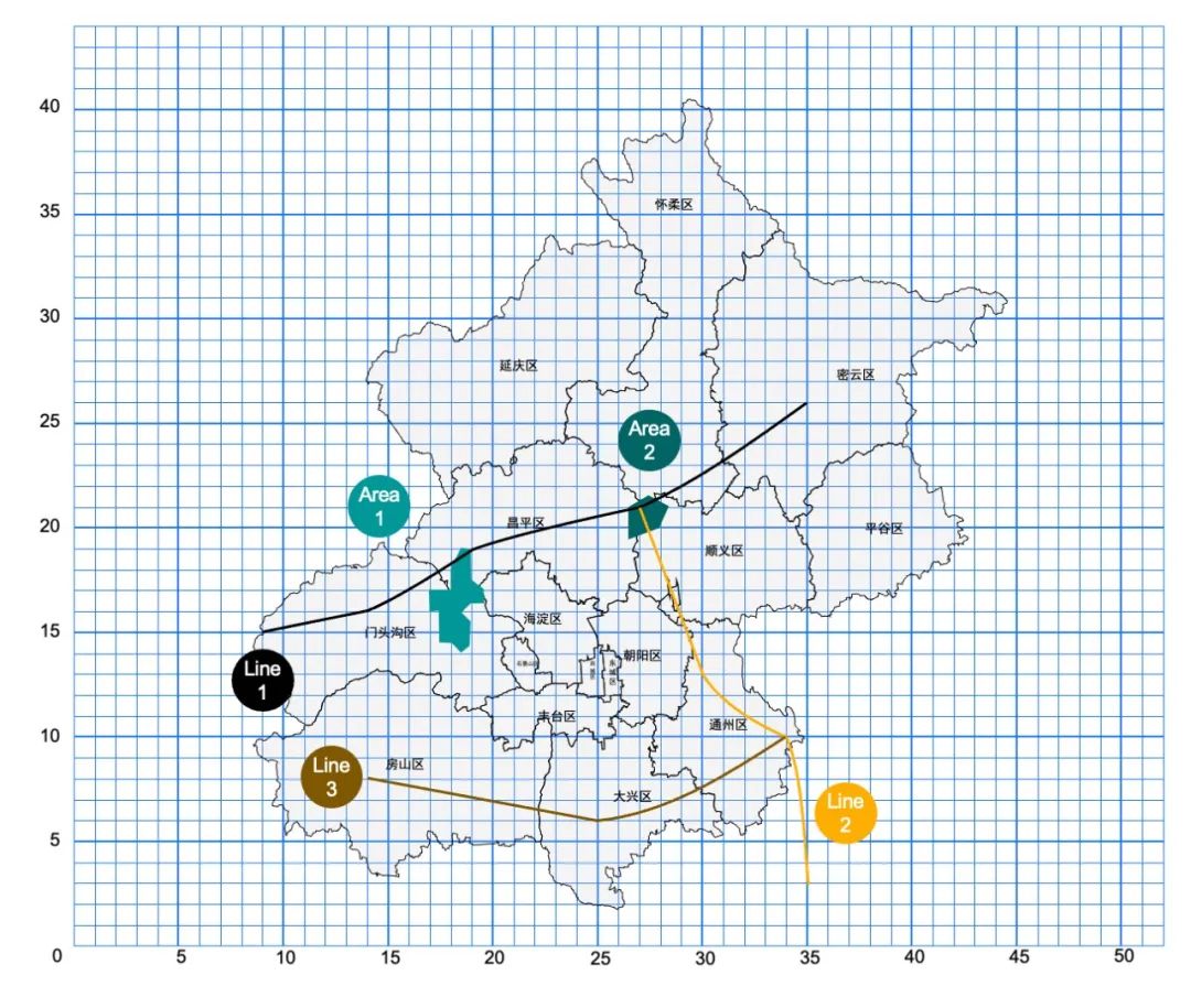 通过上图,我们构建一个简单的地图坐标系,最左下角是 (0 0) 点。我们定义两个风险区域 Area1 与 Area2 ,分别位于门头沟、昌平和海淀的交界与昌平顺义与怀柔的交界。每个风险区域有自己的开始结束时间。再定义 3 条轨迹,Line1、Line2 与 Line3 来模拟人的行动。实际上,轨迹和区域都会有很多,而这正是分布式计算的优势所在。