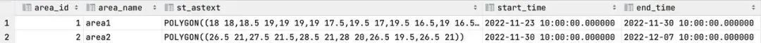 Area1: 'POLYGON((18 18,18.5 19,19 19,19 17.5,19.5 17,19.5 16.5,19 16.5,18.5 16,19 15.5,19 14.5,18.5 14,18 14.5,17.5 14.5,17.5 16,17 16,17 17,18 17,18 18))''2022-11-23 10:00:00','2022-11-30 10:00:00'Area2: 'POLYGON((26.5 21,27.5 21.5,28.5 21,28 20,26.5 19.5,26.5 21))''2022-11-15 12:00:00','2022-11-24 12:00:00'