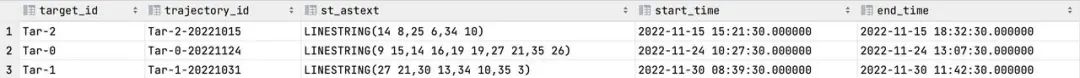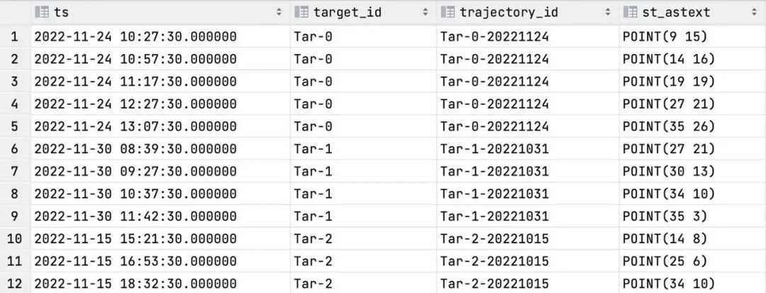 时间:'2022-11-24 10:27:30',目标ID:'Tar-0',轨迹ID:'Tar-0-221124',定位:ST_GeometryFromText('POINT(20 22)',4269))