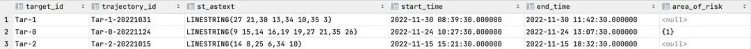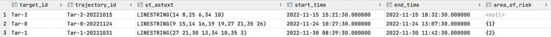 至此,我们通过每日定时任务,拿到了轨迹聚合信息与经过的关键区域信息,基于示例数据的查询结果如下,其中 area_of_risk 是一个数组,保存了经过关键区域的 area_id: