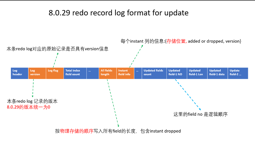 到这里,可以看到 在MySQL 8.0.29中,update redo log 引入了 instant column 的物理逻辑顺序。