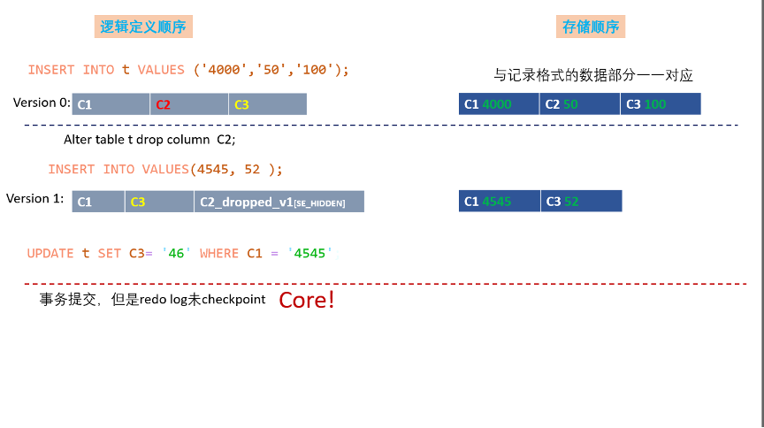 首先说明一下,在测例运行期间逻辑顺序与物理顺序的变化。 如下图所示稍微展示了 table 的逻辑定于与 InnoDB row 存储的以下细节。这里注意的是 被 dropped column 仍然会以隐藏列的形式存在于表定于中:因为 drop 之前存在的 row 还是需要这样信息解析字段。