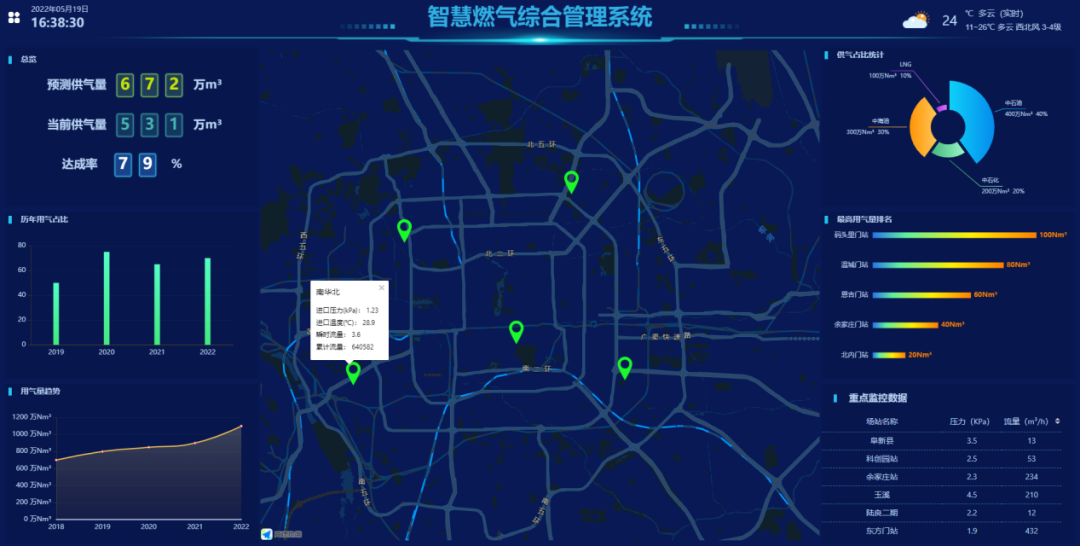通过加强天然气计量管理,充分发挥其在输气生产、经营管理中的作用,保证了生产安全平稳、保质保量、降低能源消耗和提高经济效益。通过输差控制等方式在天然气供应过程中对损耗量进行控制,提高输送效率,降低天然气损耗,对控制生产成本等起到关键作用。通过场站监控分析及调整、应急指挥,使整个系统保持平稳状态,为用户提供高质量的供气服务,保障输配系统安全运行。通过与企业内SCADA系统、地理信息系统、智能巡检系统实现数据和应用的系统融合,充分利用系统的灵活性和可扩展性,应对未来新的整合、集成需求,为集团接入更多的设备和区域场站系统,实现集中式、规模化运营的目标,降低企业运营成本,提高运营效率,有效推进燃气企业智慧调度系统规模化建设和运营的战略目标落地。相关阅读:
