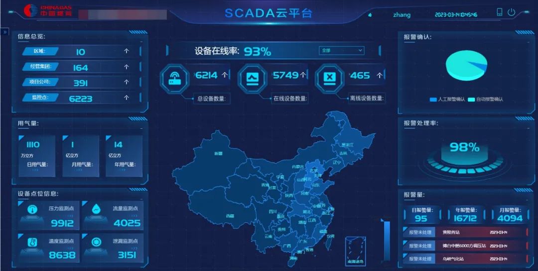 综合管理模块主要包括驾驶舱、地理信息、数据总览。驾驶舱展示集团关键信息,包含供气占比统计、设备监控统计、实时存储比、分级报警统计、重点数据轮循。在GIS地图上显示场站位置以及管网,鼠标滑动到场站图标,可以实时查看该场站重点参数,点击站点快速跳转至工艺流程画面。数据总览查看所有场站的实时数据,产生报警时数据变红标识提示,可点击变量弹出对应趋势曲线。生产运营管理模块主要包括工艺监控、报警管理、生产报表、趋势分析、设备管理、用气申报、事件管理。工艺监控展示各场站的工艺流程图,展示关键设备的实时数据,同时可查看该场站的历史曲线、历史报表、设备信息、环比统计。用户可查看其权限下的场站实时报警数据与历史报警数据,实时报警可人工确认填写处理方案与处理人员,所有采集点的报警均可自由配置,调整报警使能以及高低限值。趋势曲线与环比统计以曲线形式直观展示采集点的状态以及对比分析。设备信息可查看现场管理的各类设备信息,以及后期的维护与保养。计量日报与站点报表直观展示各参数运行状态与计量数据。用户可进行燃气申请量、批复量的信息录入。