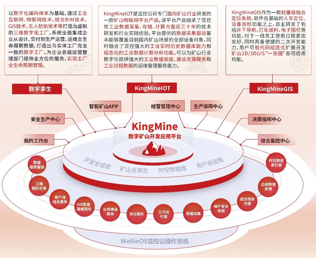 亚控科技作为数字矿山整体解决方案产品供应商,本次展会为现场观众带来重磅产品——KingMine数字矿山开发应用平台。产品基于WellinOS云操作系统研发,致力于面向矿企用户、矿山行业实施商、科研机构提供一款便捷、易用、安全、高效的覆盖矿山采、选、冶全业务流的数字化系统开发应用服务平台工具,彻底解决广大用户在建设智慧矿山众多业务系统过程中的工具平台选型的“困扰”。