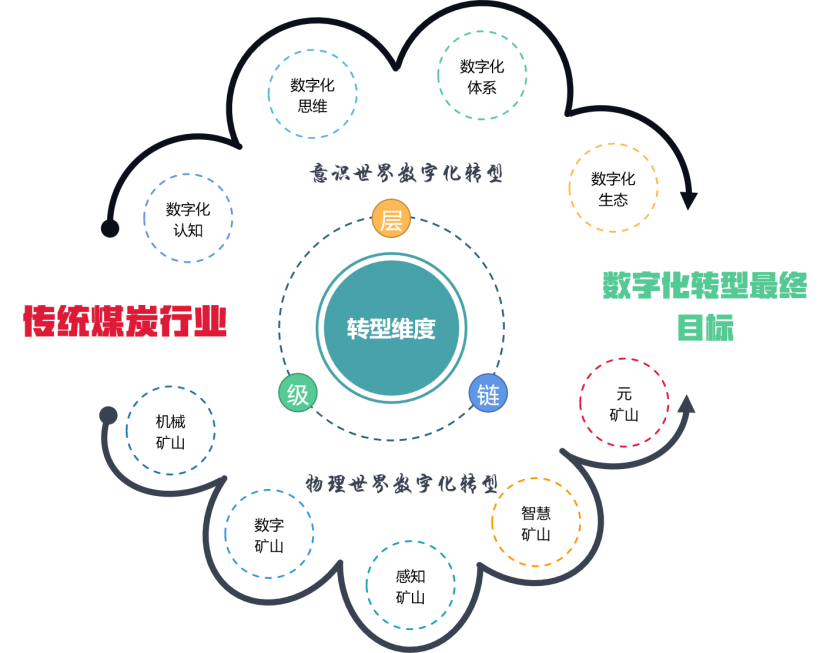 作为数字经济与实体经济融合发展的关键支撑,数字产业化和产业数字化成为当前产业转型升级的核心驱动。《“十四五”信息化和工业化深度融合发展规划》提出,要制定重点行业领域数字化转型路线图、构建制造企业数字化转型能力体系。在绿色创新、科技兴工的新时代,煤炭行业面临着转型升级、探索可持续发展之路的重大挑战与机遇,数字化转型迫在眉睫。根据各地2022年政府工作报告显示,煤炭企业的生产、管理和安全仍然是数字化转型的重要基础目标。此外,“碳达峰”“碳中和”目标的提出,绿色转型成为了煤炭企业数字化转型的新目标之一。并且,随着煤炭消费达峰和煤炭行业减量发展成为必然趋势,如何保持煤炭行业自身健康发展和做好能源“兜底”保供问题事关重大,实现煤炭行业柔性调控,避免“一刀切”式的“去煤化”和煤炭“双控”成为了煤炭行业数字化转型又一重要目标。
