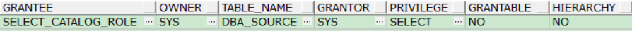 1SELECT * FROM Dba_Tab_Privs d WHERE d.table_name='DBA_SOURCE' AND D.grantee='SELECT_CATALOG_ROLE';
