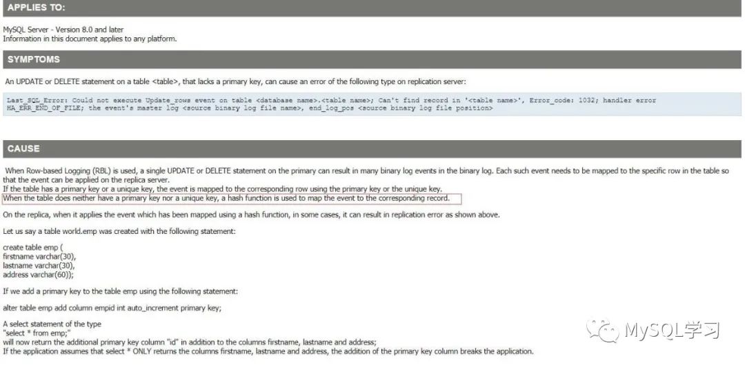 数据量和本BUG相关,如果数据量大则crc32 不同记录产生相同crc32的可能性就高一些。 本BUG一直未修复,BUG提交者提交了patch,实际上就是当entry为NULL的时候结束循环2,这样就会扫描表的下一条数据,而不是直接修改本行数据。不知道官方是否觉得BUG中提交的patch不合适,还是其他原因。 这个BUG看起来和Bug#28846386: RBR + STORED FUNCTION WITHOUT PRIMARY KEY - CAN'T FIND RECORD IN 有关,可能是修复一个BUG引入的新的BUG,这是8017修复的。 8.0 hash scan 已经成为了默认的算法,因此概率大大提高。 看来主键越来越重要了,有主键自然不会触发这个问题,还是重要事情说三遍吧,加主键、加主键、加主键。 新特性解读 | MySQL 8.0 GIPK 不可见主键