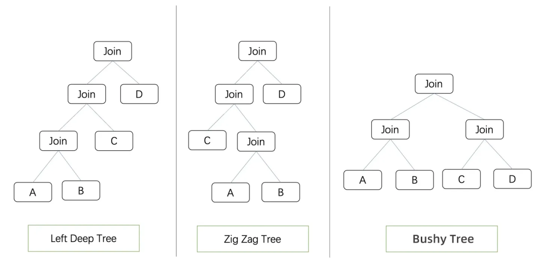 基本上数据库实现一个Join算法的时候只会实现两个输入的情况。Join Tree是一棵二叉树,其中树上的叶子节点代表需要被连接的表,非叶子节点代表Join算子。根据Join Tree的形状,我们可以将其归类为Left Deep Tree, ZigZag Tree, Bushy Tree。Left Deep Tree,就是大名鼎鼎的左深树,Join节点的右侧只能是一个叶子节点,很多数据库都会默认将左深树作为Join Reorder的搜索空间。ZigZag Tree,可以理解为左深树的基础上可以进行左右节点的交换。Bushy Tree,结构最为自由,表可以按照任意顺序Join。