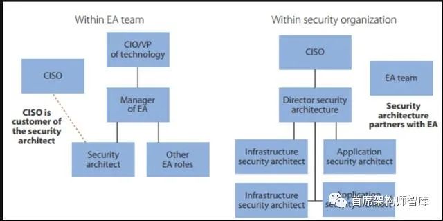 安全体系结构和企业体系结构(EA)之间的关系非常重要。EA集团帮助创建一个以业务为中心的企业架构,将战略与技术联系起来。安全必须是EA的一部分。无论组织结构是什么,安全架构师都应该与企业架构师和首席信息安全办公室密切合作。更多细节请参见图。