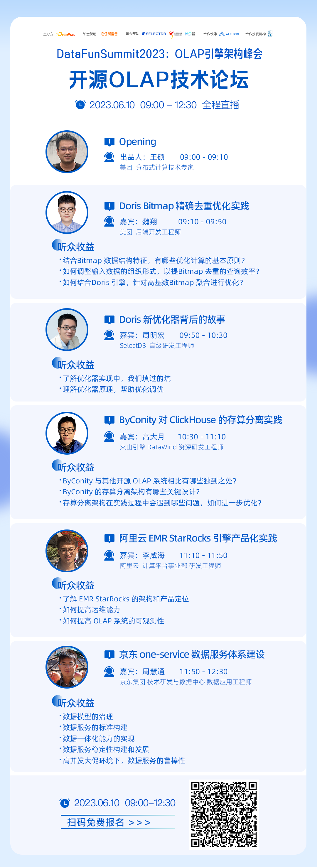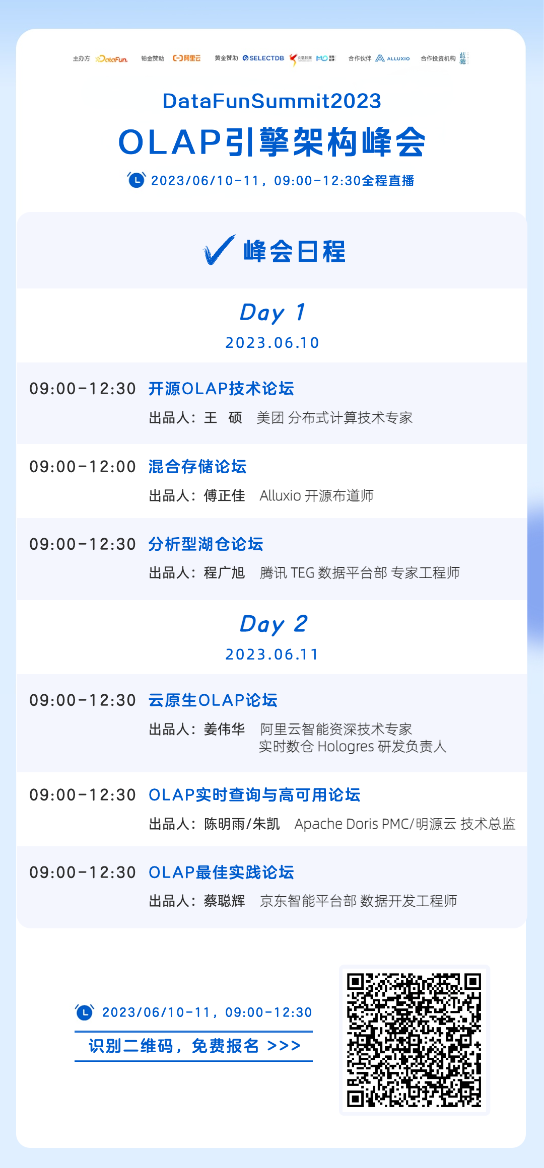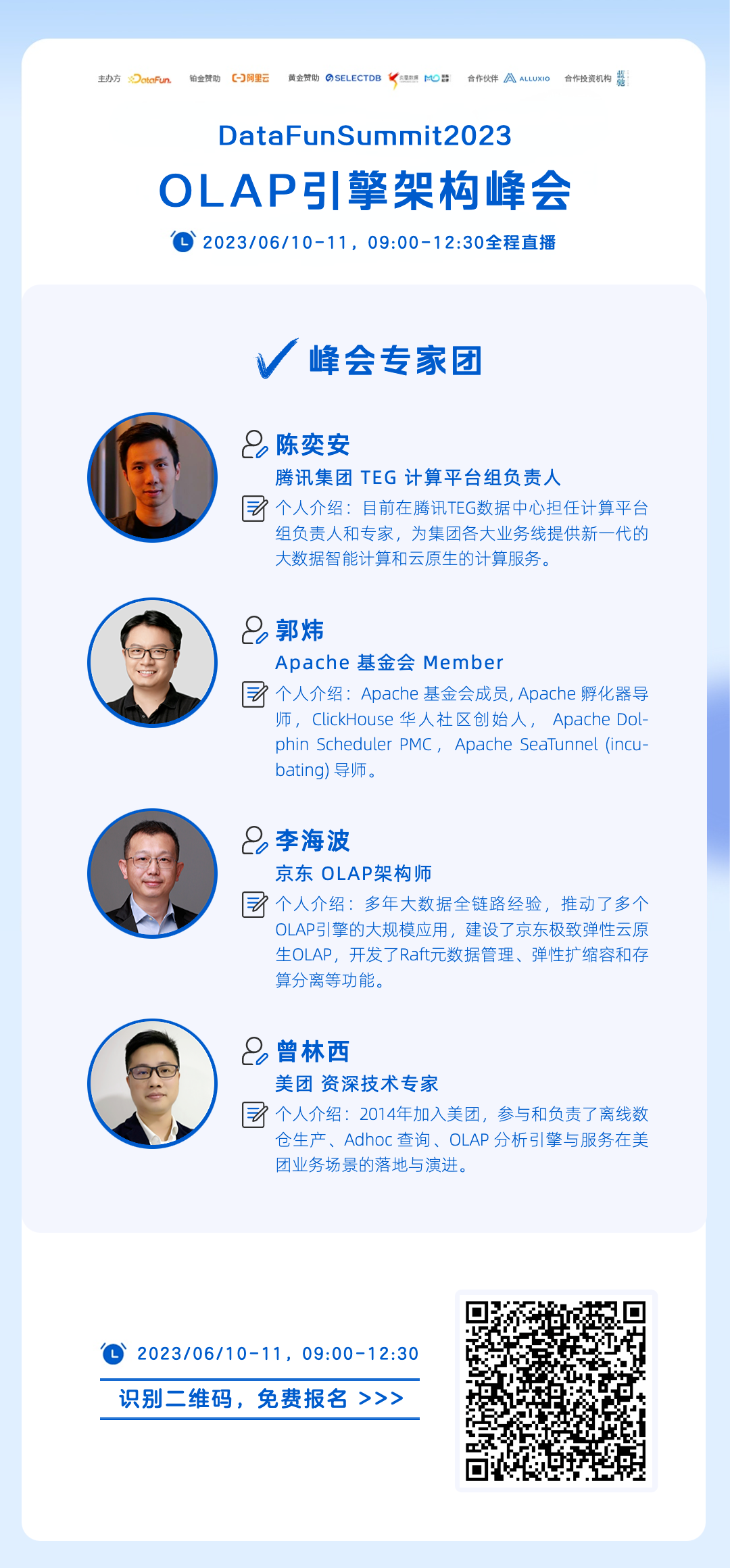 OLAP风往哪吹?国内大佬们都在卷什么?敬请关注2023年6月10-11日,09:00-12:30,DataFun举办的第3届OLAP引擎架构峰会,将给你答案!本次峰会由4位专家团成员与7位出品人精心策划而成,共包含:开源OLAP技术、混合存储、分析型湖仓、云原生OLAP、OLAP实时查询与高可用、OLAP最佳实践等6个论坛,邀请30余位来自一线的OLAP专家,进行深度分享交流。本次峰会将全程直播,欢迎大家识别二维码免费报名收看,周末一起卷起来!