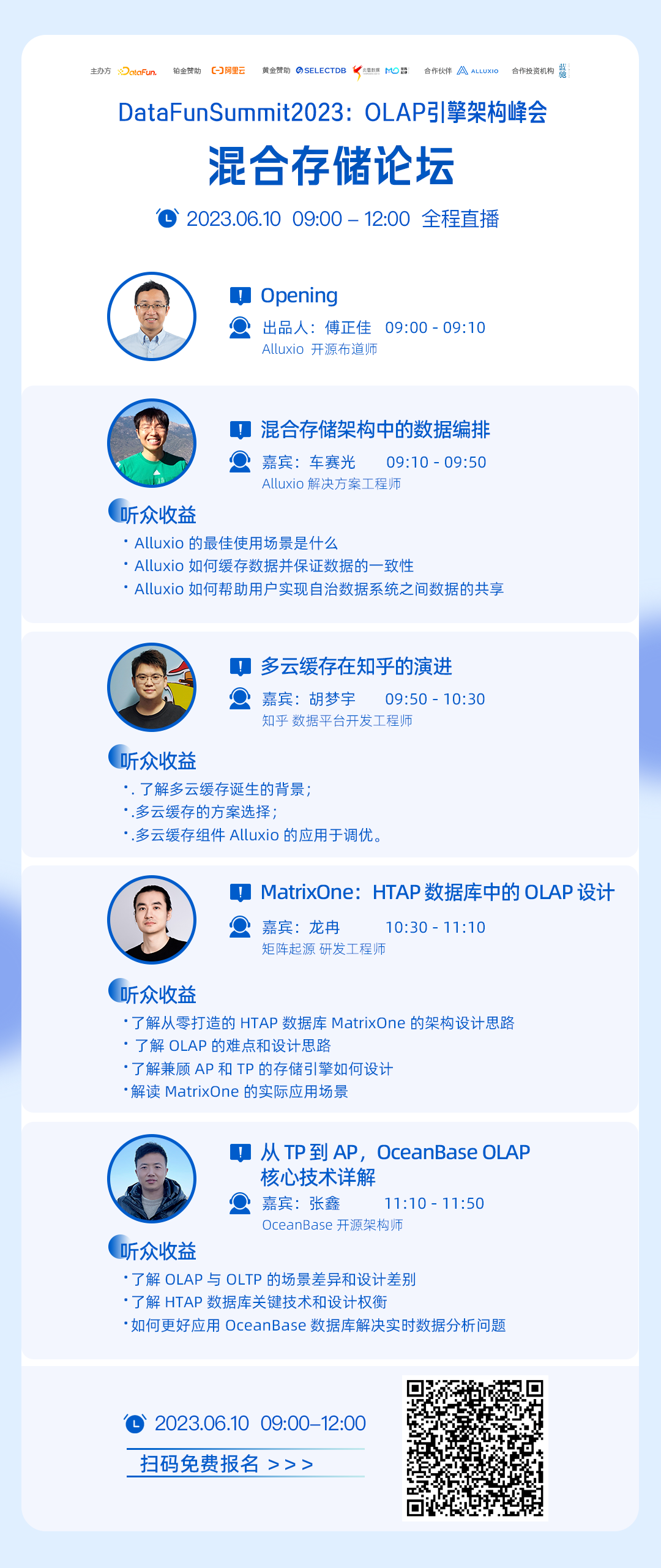 个人介绍:傅正佳,Alluxio 开源布道师。本科毕业于上海交通大学电子系,随后取得香港中文大学信息工程博士学位,毕业后加入新加坡高级数字科学中心(美国伊利诺伊大学在新加坡的研究所)从事科研工作,在计算机网络和分布式系统领域相关的顶级国际会议发表多篇论文。加入Alluxio前,傅正佳曾在新加坡科技公司Bigo Technology担任机器学习研发总监。演讲提纲:讲师会首先介绍 Alluxio 数据编排的技术原理和适用场景。然后着重介绍在混合云、混合存储架构中,如何实现基于 Alluxio 的数据联邦,为自治数据系统之间共享数据提供桥梁。2. Alluxio 如何缓存数据并保证数据的一致性3. Alluxio 如何帮助用户实现自治数据系统之间数据的共享个人介绍:2019 年加入知乎后一直从事大数据架构开发相关工作,主要工作内容集中于 Flink,HDFS,Alluxio。演讲提纲:随着云原生技术的飞速发展,多云架构已成为当今各大互联网公司的主流架构之一。如何在多个数据中心之间共享数据,是多云架构首先需要解决的问题。本次分享将以知乎的算法场景为主,介绍多云缓存在知乎的演进过程,以及多云缓存组件 Alluxio 在知乎的应用。3. 多云缓存组件 Alluxio 的应用于调优。个人介绍:企业和垂直搜索引擎 Search Formula-1 的实时索引库,以及高并发 Succinct 索引库作者;目前负责 MatrixOne 计算引擎开发。演讲题目:MatrixOne:HTAP 数据库中的 OLAP 设计3. MatrixOne 如何隔离 AP 和 TP1. 了解从零打造的 HTAP 数据库 MatrixOne 的架构设计思路3. 了解兼顾 AP 和 TP 的存储引擎如何设计个人介绍:张鑫,OceanBase开源架构师。曾就职于互联网大厂和金融科技公司,主导过多项数据库升级、迁移、国产化落地等工作。拥有丰富的数据库管理经验,曾负责数据库一体化管控平台研发工作。对各类数据库系统有较深理解,目前深耕分布式数据库的研究与应用。演讲题目:从 TP 到 AP,OceanBase OLAP 核心技术详解演讲提纲:开源数据库 OceanBase 作为一款 HTAP 数据库已经广为人知,实际上,作为原生分布式数据库,OceanBase 从早期版本就具备较好的分析处理能力,近期发布的 4.1 版本,又进一步增强 AP 能力。本次分享将以用户实践案例为基石,主要介绍 OceanBase 数据库核心特性,以及如何在做到极致 TP 的情况下,又具备 AP 的能力,从优化器的各种优化逻辑,到执行引擎的分布式并行执行。1. 了解 OLAP 与 OLTP 的场景差异和设计差别3. 如何更好应用 OceanBase 数据库解决实时数据分析问题随着湖仓技术的持续演进,数据仓库和数据湖方案在快速演进和弥补自身缺陷的同时,二者之间的边界也逐渐淡化,湖上建仓、仓中数据降冷到湖、物化视图、冷热融合查询等方案也越来越多的成为各个公司的标配,各大厂商也陆续提出了自己的湖仓融合方案,通过湖仓融合技术来提升业务使用体验的同时也降低了业务的使用成本。本论坛邀请到了来自腾讯、阿里、Cloudera、炎凰数据、镜舟科技等公司的几位专家,分享关于他们的新一代湖仓融合架构,以及如何使用物化视图加速数据湖查询,并且会分享一些Impala在访问数据湖场景下的性能优化经验,通过本次分享,听众可以了解新一代湖仓湖仓融合架构、物化视图等方向的前沿技术。