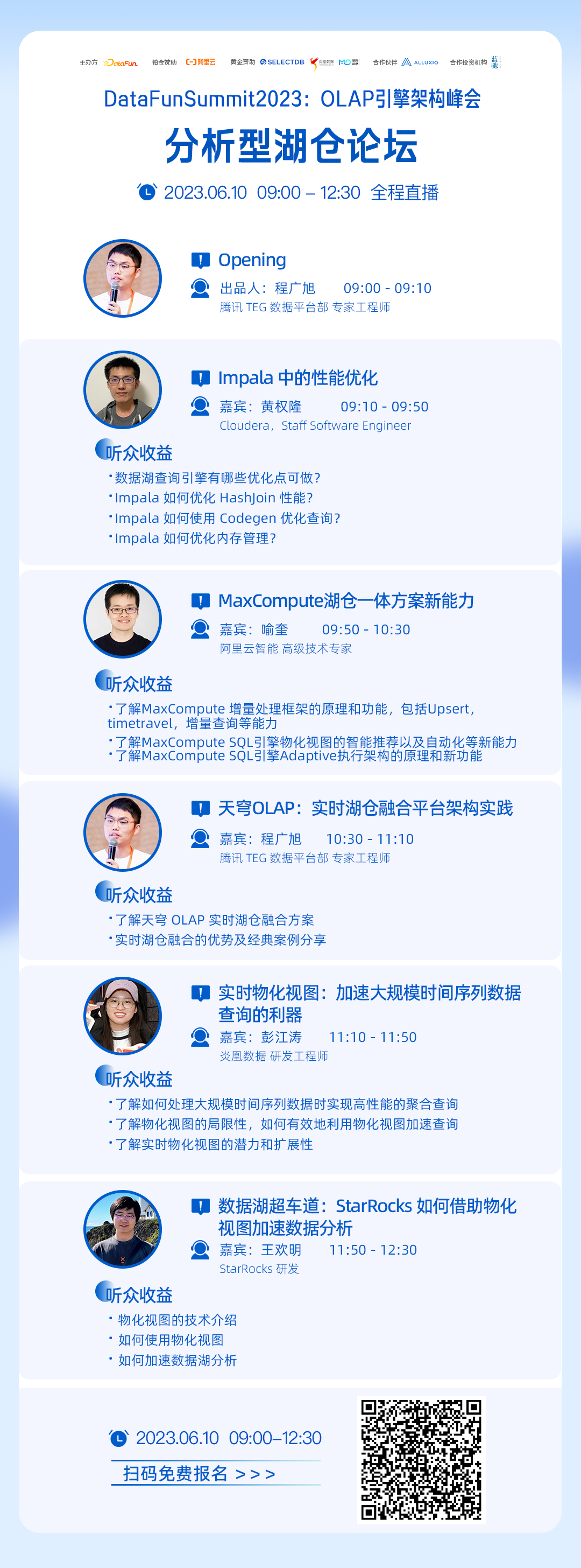 出品人:程广旭 腾讯 TEG 数据平台部 专家工程师个人介绍:腾讯大数据 OLAP 平台技术负责人,Apache HBase/InLong PMC 成员,有10年大数据相关工作经验,专注在 OLAP 领域及 KV 存储。演讲提纲:本次分享将会介绍基于天穹 OLAP 平台的实时湖仓融合架构。主要内容包括:个人介绍:哈工大本硕毕业后,进入阿里巴巴云智能集团工作近10年,一直从事大数据分布式计算分析引擎的设计开发工作,重点从事MaxCompute SQL引擎从0到1各个版本的重构设计优化工作。2. MaxCompute SQL引擎物化视图新能力介绍3. MaxCompute SQL引擎Adaptive执行架构揭秘1. 了解MaxCompute 增量处理框架的原理和功能,包括Upsert,timetravel,增量查询等能力2. 了解MaxCompute SQL引擎物化视图的智能推荐以及自动化等新能力3. 了解MaxCompute SQL引擎Adaptive执行架构的原理和新功能黄权隆 Cloudera,Staff Software Engineer个人介绍:黄权隆,Cloudera研发工程师,Apache Impala PMC 成员和 Committer,ORC Committer。毕业于北大计算机系,曾就职于Hulu大数据基础架构团队,参与大数据集群的维护、调优和二次开发。现就职于Cloudera,主要从事Impala系统的开发。演讲提纲:Impala 是一个高性能的 MPP 查询引擎,纯计算无状态的特性使其天然就适合数据湖的场景。本次分享将介绍 Impala 中的性能优化,包括 HashJoin 的优化、Codegen、内存管理等。1. 数据湖查询引擎有哪些挑战?