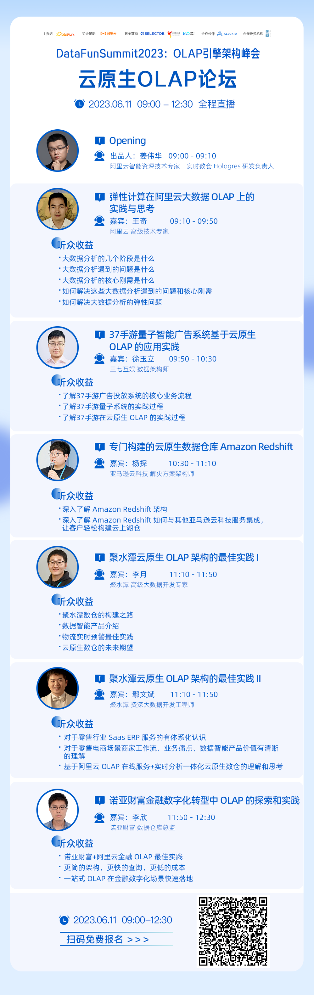 出品人:姜伟华 阿里云智能资深技术专家,实时数仓Hologres研发负责人个人介绍:姜伟华,复旦大学博士,阿里云资深技术专家,花名果贝,阿里云产品实时数仓Hologres研发负责人,超过10年大数据研发经验,开源社区贡献者,曾创立国内最早的大数据发行版,领导知名公司大数据项目开源,他带领的团队创立了2个Apache开源项目,涌现出超过10名Apache Committer。个人介绍:王奇,阿里云智能高级技术专家,花名慧青,阿里云产品实时数仓 Hologres 研发,超过8年大数据研发经验,目前主要聚焦于 Hologres 分布式、弹性计算等相关工作。演讲题目:弹性计算在阿里云大数据 OLAP 上的实践与思考1. 介绍目前大数据 OLAP 遇到的分析性能、资源隔离、高可用、弹性扩缩容等核心问题2. 解析阿里云 Hologres 是如何解决极致性能、弹性、业务永续、性价比等核心刚需的最佳实践3. 分享阿里云 Hologres 弹性计算组在弹性计算、资源隔离上的探索和创新个人介绍:长期从事大数据和数据应用的研发工作。曾主导某互联网金融企业实时风控平台的产品研发,具有丰富的数据中台建设实践经验。现任三七互娱旗下子公司37手游的数据架构师,主要负责数据仓库和数据中台的建设工作,以及广告归因和广告投放等系统的架构设计。演讲题目:37手游量子智能广告系统基于云原生 OLAP 的应用实践演讲提纲:主要介绍37手游的业务背景及特点,量子系统的介绍及核心业务流程、业务价值,量子系统的技术架构的演进等,还介绍了37手游 OLAP 的实践以及37手游量子系统的一些未来规划。具体内容包括:个人介绍:亚马逊云科技解决方案架构师,负责互联网行业云端架构咨询和设计。曾就职于 NTTDATA,服务国内、海外日企客户。演讲题目:专门构建的云原生数据仓库 Amazon Redshift3. Amazon Redshift 之 Spectrum1. 深入了解 Amazon Redshift 架构2. 深入了解 Amazon Redshift 如何与其他亚马逊云科技服务集成,让客户轻松构建云上湖仓李月/鄢文斌 聚水潭 高级大数据开发专家/资深大数据开发工程师李月,十年数据库、大数据开发和技术架构经验,14年-21年阿里云工作经历,参与了淘宝单元化、集团上云、国际业务全球化等关键业务发展,21年加入聚水潭,主导数仓架构升级,商业化产品研发体系的搭建工作。鄢文斌,19年硕士毕业一直从事数据开发,目前在聚水潭主要负责数据产品的开发工作。1. 对于零售行业 Saas ERP 服务的有体系化认识2. 对于零售电商场景商家工作流、业务痛点、数据智能产品价值有清晰的理解3. 基于阿里云 OLAP 在线服务+实时分析一体化云原生数仓的理解和思考个人介绍:负责诺亚财富数据仓库建设,推动大数据技术在金融领域的落地和应用。之前主要工作:喜马拉雅、百姓网、Ebay 等,硕士毕业于同济大学。演讲题目:诺亚财富金融数字化转型中 OLAP 的探索和实践2. 复杂业务挑战:自建 OLAP 服务集群面临运维难、用数慢、数据割裂等问题3. 技术选型:应对金融领域特征的 OLAP 选择· 金融数据服务快速落地(API、明细数据、看板)数据分析已经成为企业决策的重要工具,而OLAP数据分析则是其中的重要组成部分。在现今快节奏的商业环境中,数据分析的实时性至关重要。实时的数据分析可以帮助企业更快速地发现问题和机会,并做出更明智的决策。而OLAP数据分析则可以提供快速的多维数据分析,帮助企业更好地理解业务情况。同时OLAP具有高可用的特点,但也存在一些影响集群稳定性的因素,如数据或查询不均衡、硬件故障等。本次分享我们邀请到了来自联想、SelectDB、京东、腾梭科技、货拉拉等公司的几位专家,分别从高并发实时查询技术和金融业务实践等方面,为大家分享实时查询场景下的技术内幕和应用。并围绕着ClickHouse、RaftKeeper和Doris等重要技术主题展开,探讨高可用实践和业务应用的关键问题。从技术要点到实际案例,深入了解大数据技术的最新趋势,以及在构建稳定、可靠的数据中台、跨机房高可用集群和稳定性保障方面的挑战和解决方案。通过本次分享,听众可以了解在提升数据时效性和高可用方面的前沿技术态势,以及如何结合业务需求,为企业赋能。