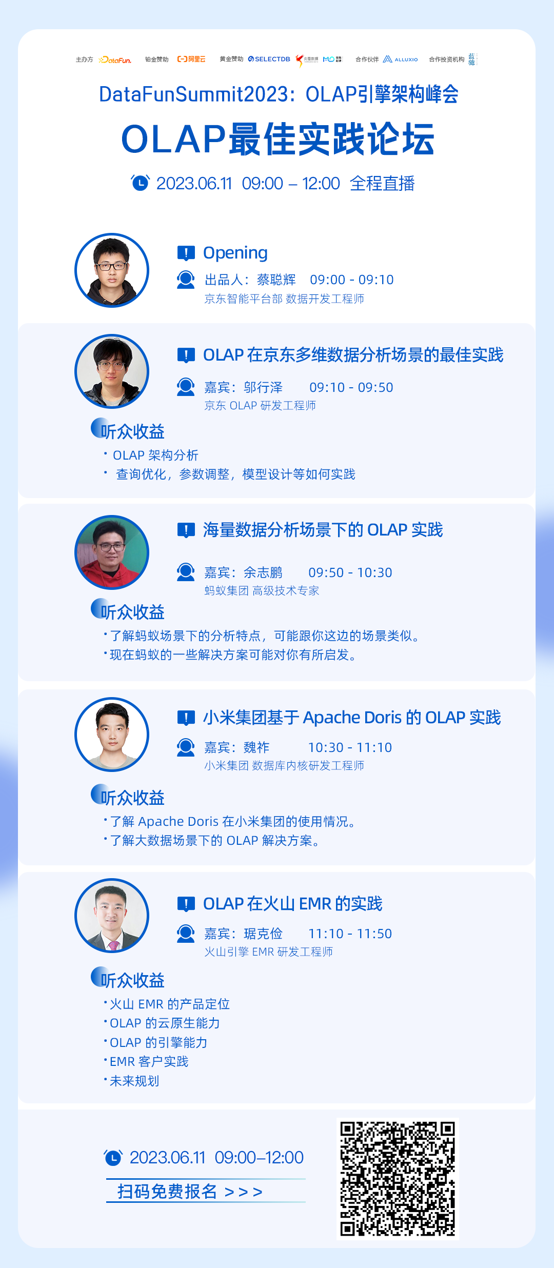 个人介绍:陈明雨,前百度资深研发工程师,Apache Doris PMC 成员。8年分布式系统研发经验,一直专注于分布式可扩展分析型数据库领域。个人介绍:资深架构师,开源爱好者,腾讯云TVP,Apache DolphinScheduler Committer、ClickHouse Contributor,《企业级大数据平台构建:架构与实现》、《ClickHouse原理解析与应用实践》作者,公众号《ClickHouse的秘密基地》运营者,ClickHouse 布道者。个人介绍:贺钰城,多年从事大数据平台架构设计、数据流量分析、数仓建设等关于数据中台建设方向,参与建立了 ClickHouse 中国开源社区 。2010年创建 ptmind 担任 CTO&技术合伙人,2019年加入易观数科担任合伙人。2021年加入联想 ,担任开源优化架构师。演讲提纲:ClickHouse 在联想的数据中台中如何落地已经在高可用方向的探索。个人介绍:毕业于南京师范大学, 曾在百度、字节跳动从事分布式存储研发工作,目前于 SelectDB 从事 Doris 数据库内核研发。演讲提纲:随着越来越多的用户将 Apache Doris 用于构建企业内部的统一分析平台,我们需要面对处理和分析更大规模数据量和更高并发承载的要求。同时,我们也需要满足企业多样化的数据分析需求,从传统的统计报表、即席查询、交互式分析等场景,扩展到推荐、风控、标签画像和物联网等更多业务场景中。其中,数据服务(Data Serving)是其中一类具有代表性的需求,指向用户或企业客户提供数据访问服务,通常是高并发的点查询。在过去,为了满足这类业务需求,通常采用不同的系统组件分别承载对应的查询访问。然而,这种架构复杂,存在冗余存储和高维护成本的问题。随着 Apache Doris 的发展,我们面临着如何更好地满足用户在高并发查询场景下的业务需求的挑战。在即将发布的 2.0 版本中,我们引入了一系列面向点查询的优化手段,极大地拓宽了 Apache Doris 在高并发场景下的能力边界。接下来,我将为大家介绍如何应对高并发查询的挑战,并详细阐述 Apache Doris 2.0 版本中引入的新特性。主要内容包括:2. Apache Doris 2.0 相关新特性揭秘通过以上优化手段和新特性,Apache Doris 可以更好地应对高并发查询的需求,实现单节点上万 QPS 的并发支持。这将大大提升系统的查询性能,降低资源消耗,满足用户在数据服务场景下的业务需求。1. 了解 Doris 中高并发技术, 更合理的建表,提升查询性能2. 引入相关优化技术, 减少对 HBase 等系统的依赖,在 Doris 一套系统内解决问题个人介绍:毕业于西南大学,目前在京东主要负责 OLAP 内核研发和日常运维工作,对大数据系统尤其是 OLAP 系统有兴趣,RaftKeeper、ClickHouse、Poco 等项目活跃开发者。演讲题目:RaftKeeper:构建跨机房高可用 OLAP 集群1. RaftKeeper 分布式共识服务的研发与性能优化实践个人介绍:8年金融科技从业经验、负责全流程产品研发及管理。演讲题目:星云零售信贷基于 Doris 的 OLAP 演进之路杨秋吉/梁健聪 货拉拉 OLAP负责人/大数据工程师个人介绍:货拉拉大数据引擎组-大数据专家/大数据SRE组-大数据工程师。演讲题目:货拉拉大数据 Doris 稳定性保障实践· 货拉拉基于 Doris 的 OLAP 业务介绍1.了解货拉拉基于 Doris 的 OLAP 业务应用2.了解 Doris 引擎特点、掌握如何进行业务稳定性保障、服务稳定性保障多维数据分析是企业信息化和智能化最热门的需求之一,而优秀的OLAP系统是做好多维数据分析的基石。在此基础之上,如何针对特定的业务场景对OLAP系统进行选型,采用可行的满足业务需求的方案解决OLAP实践中遇到的诸多问题,则成为了我们这次论坛关注的重点。好的OLAP实践可以帮助我们有效提升开发效率和节省资源成本,通过本次论坛,听众将了解到来自京东,蚂蚁金服,小米,字节等互联网大厂的专家在OLAP实践中遇到了哪些问题,以及如何优雅地解决这些问题,帮助业务多快好省地完成多维数据分析。