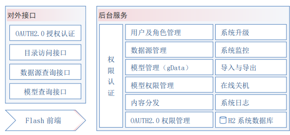 OAUTH2.0 授权认证 目录访问接口 数据源查询接口 模型查询接口 数据源管理 系统监控 模型管理(gData) 导入与导出 模型权限管理 在线关机 内容分发 系统日志 OAUTH2.0 权限管理 H2 系统数据库