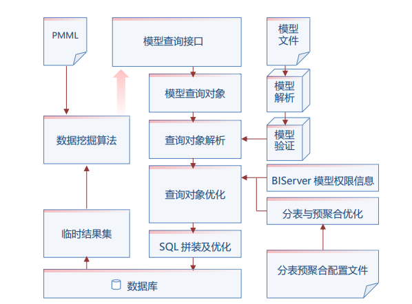 GBase BI5 通过元数据管理、数据视图来管理系统业务数据,实现物理层-逻辑层-主题层的建模工具。 大幅简化设计和开发 BI 系统工作,提供把数据从复杂的 IT 语言转换为直观、清晰地业务语言的桥梁。 模型 gData 是 GBaseBI V5 中的核心功能模块,系统中数据查询均需要使用 gData 进行查询,模型是对用 户业务数据的语义映射,它面向最终使用用户,使用户在查询设计时候无需面对复杂的业务数据结构。模型 的设计在 BIServer 中完成,通过 BIServer 提供的接口进行模型访问和模型查询,模型的构架如下图所示: