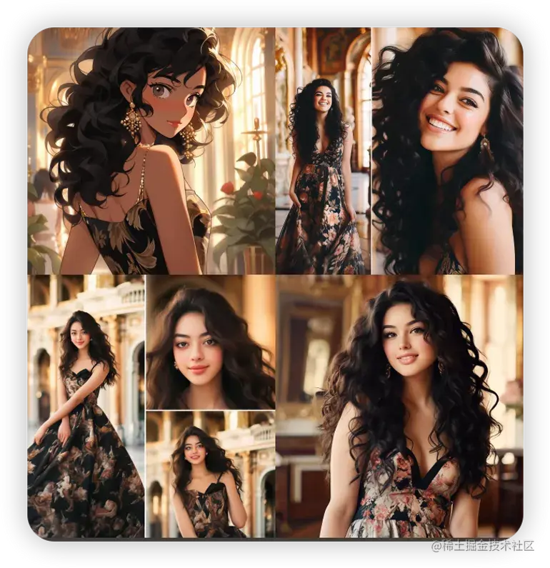我的描述:一个25岁左右的大眼睛亚洲美女,脸带着微笑,身穿黑色碎花抹胸连衣裙,简单的珍珠项链和耳环,卷发刘海利落,在淡黄色的富丽堂皇的宫殿背景下