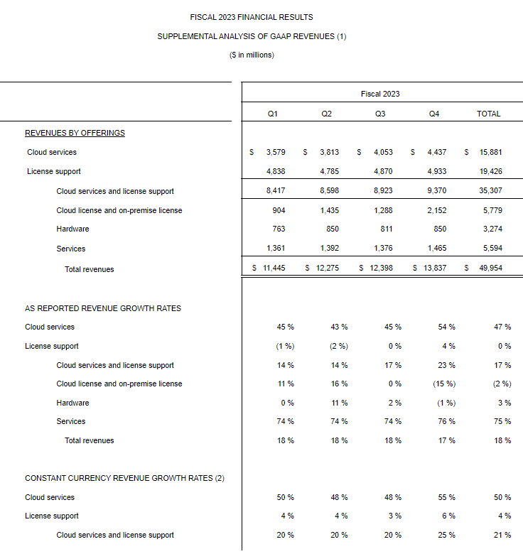 在 2023 财年,甲骨文报告的云服务和许可支持总收入为 353 亿美元。