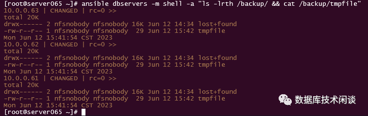 [root@server065 ~]# ansible dbservers -m shell -a "showmount -e 10.0.0.65"10.0.0.62 | CHANGED | rc=0 >>Export list for 10.0.0.65:/backup 10.0.0.65/1610.0.0.63 | CHANGED | rc=0 >>Export list for 10.0.0.65:/backup 10.0.0.65/1610.0.0.61 | CHANGED | rc=0 >>Export list for 10.0.0.65:/backup 10.0.0.65/16[root@server065 ~]#