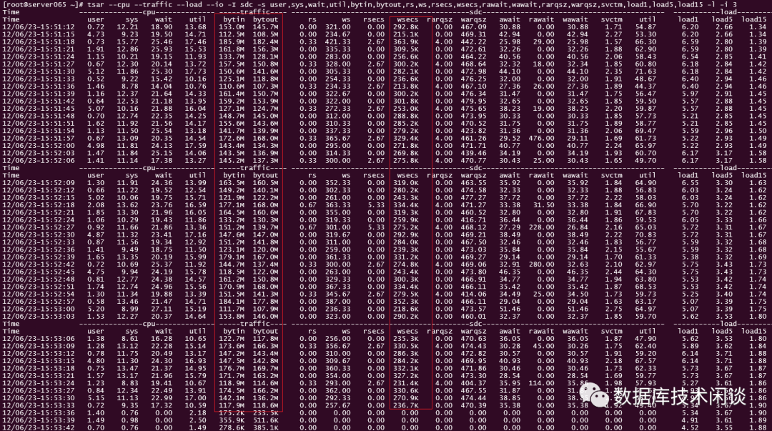 tsar --cpu --traffic --load --io -I sdc -s user,sys,wait,util,bytin,bytout,rs,ws,rsecs,wsecs,rawait,wawait,rarqsz,warqsz,svctm,load1,load5,load15 -l -i 3